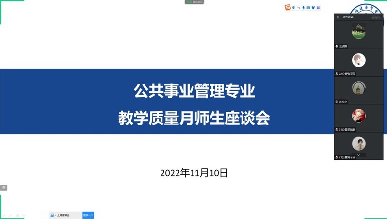 为进一步提升专业教学水平,深入了解近期教学工作,加强日常教学管理,规范教学运行,促进学院内涵式高质量发展。2022年11月10日19:30,万博max体育官方网站公共事业管理教研室以线上方式召开期中教学质量师生座谈会,公共事业管理教研室全体教师及学生代表参加。
