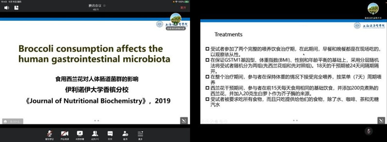 另外,曲老师还分享了《食用西兰花对人体肠道菌群的影响》的文献,指出人类胃肠菌群与健康的关系备受关注,而对特定食物如何改善微生物群的认识和理解有限。该文章发现食用西兰花对细菌丰富度无显著变化,但可增加多形拟杆菌、减少厚壁菌门,西兰花可通过调节胃肠道菌群种类来影响人体健康。曲老师还分享了对学习这篇文献的感悟,他表示,现在很多研究基本上做的是单一的营养素,由于食物营养成分相对较多,对其研究较少,但随着系统生物学的发展,将有助于这方面的研究。曲老师还提到,这篇文章虽然样本数量和检测的微生物种类不多,但是得出来的结果仍然具有说服力,实验研究方法值得借鉴。