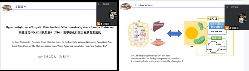 随后,刘老师分享了题为《肝脏线粒体NADH脱氢酶6(ND6)高甲基化引起全身胰岛素抵抗》的文献。指出,目前还没有研究充分描述ND6相关调节网络在疾病发病机制中的详细机制,这篇文章揭示了2型糖尿病患者ND6高甲基化与胰岛素抵抗之间的新联系,证实了糖尿病患者ND6的特异性高甲基化会导致ND6表达抑制和线粒体功能障碍以致全身胰岛素抵抗。刘老师详细讲解了文献中所用到的研究思路、研究方法,包括细胞实验及动物实验检测指标的选取、相关基因敲低或过表达的方法、细胞器分离及免疫荧光标记等内容。刘老师还表示,这篇文章对于做机制研究提供了很好的参考。