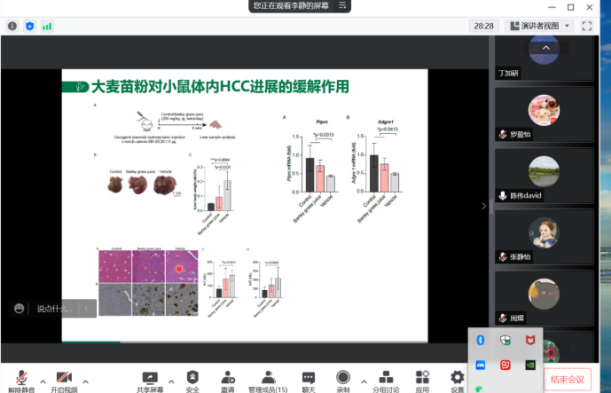 李静老师也分享了她工作后的一些探索性科研工作——作物营养功能,主要研究大麦幼苗中的活性黄酮成分,从大麦幼苗中分离鉴定黄酮类化合物,通过抗氧化活性实验筛选出5种代表性成分,结合体内动物实验,发现大麦青汁可以缓解小鼠体内肝癌进展,同时建立HPLC同步检测方法,筛选麦幼苗中的活性黄酮成分,为产品的开发和大麦品种的筛选提供了理论依据。