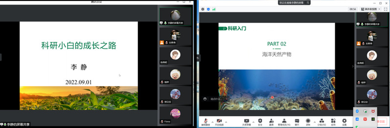 会上,李静老师介绍了本科毕业设计、硕士、博士期间的研究工作,本科研究内容聚焦山楂黄烷醇抗衰老的探索。随后,她重点介绍了在硕博期间的研究方向——海洋天然产物,她指出,海洋天然产物引起了许多药物学家和化学家的关注,其中,海绵是海洋天然产物的一个重要来源,同时也是新药发现的一个重要源泉,其中重点介绍了海绵样本的采集和鉴定方法,海绵样本的提取、分离和纯化方法,以及对得到的单体海绵化合物进行结构鉴定和活性评价等一系列操作步骤,在她鉴定的三种海绵活性化合物中发现,三种海绵具有抗炎活性强、抗菌活性好的优点。