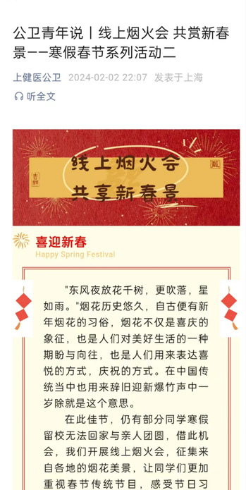 因部分同学寒假留校无法回家与亲人团圆,学院特面向全体同学,开展线上烟火会。收集大家关于新春烟火的摄影、绘画、书法等清晰的原创文艺作品,征集来自各地的烟花美景,让同学们更加重视春节传统节目,感受节日习俗,也为寒假留校学生带去家的温暖。