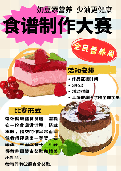 活动流程:设计健康膳食食谱,需提交一份食谱设计稿。提交的作品将由学院两位老师评选出一等奖、二等奖、三等奖若干,可获得营养周集市奖励和精美小礼品。(参与即有0.2德育分奖励)