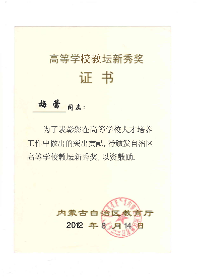 教学教改方面荣获各类奖项13项。主要包括:2012年内蒙古自治区第二届高等学校教坛新秀奖。2012年度包头市优秀教师。2005年beat365网页版登录入口第一届“教学优秀奖”,2009年beat365网页版登录入口第二届“教学优秀奖”,2011年beat365网页版登录入口第三届“教学优秀奖”。2006年校级教学成果奖一等奖1项,2009年校级教学成果奖二等奖2项,2015年校级教学成果奖二等奖1项。