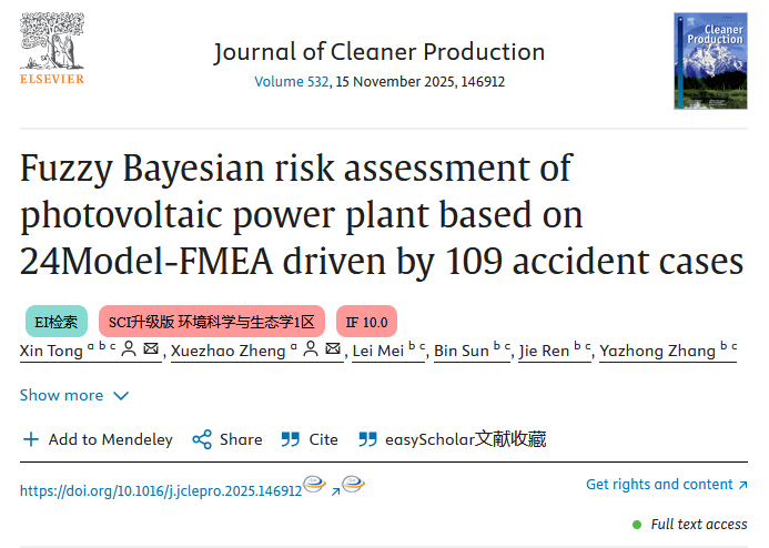 近日,beat365网页版登录入口应急管理系骨干教师童鑫在工程环境与可持续发展领域取得新突破,相关成果“Fuzzy Bayesian risk assessment of photovoltaic power plant based on 24Model-FMEA driven by 109 accident cases”发表于国际TOP期刊《Journal of Cleaner Production》。教师童鑫为论文的第一作者兼通讯作者。