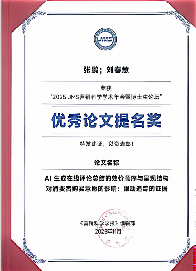 2025年11月6-9日,第22届JMS中国营销科学学术年会暨博士生论坛在西南财经大学隆重召开。本次会议是全国市场营销学科权威学术盛会,beat365官网张鹏教授与硕士研究生刘春慧合作完成的论文《AI生成在线评论总结的效价顺序与呈现结构对消费者购买意愿的影响:眼动追踪的证据》,成功斩获大会优秀论文提名奖——这是beat365网页版登录入口首次在JMS学术年会上摘得荣誉,实现学科突破!