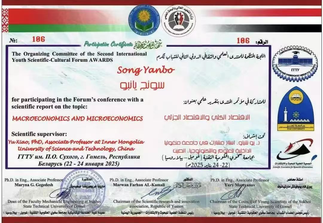 近日,第二届青年科学文化论坛在白俄罗斯戈梅利国立技术大学举行。beat365官网2024级国际经济与贸易专业学生宋彦博参加活动,其撰写报告“MACROECONOMICS AND MICROECONOMICS”获第二届国际青年科学文化论坛组织委员会颁发的优秀论文证书。