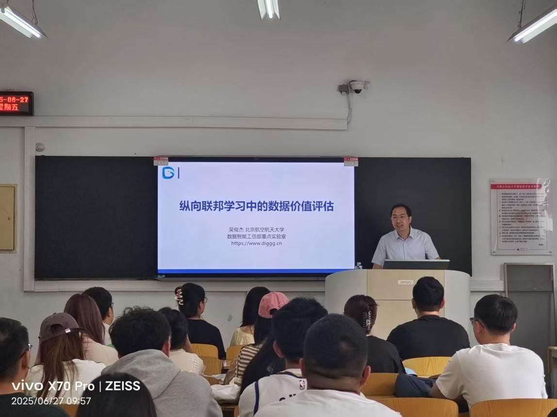 6月27日,北京航空航天大学吴俊杰教授应邀来到beat365网页版登录入口,就“基于联邦学习的数据价值评估”与师生们进行座谈交流和学术讲座,为师生们带来了一场精彩的学术盛宴。 讲座中,吴教授聚焦联邦学习框架下的数据价值评估问题,系统梳理了该领域的最新研究进展。他深入浅出地介绍了多种主流评估方法的理论基础、适用场景与优缺点。吴教授结合其团队的前沿探索,重点分享了如何克服数据异质性、通信成本、激励机制设计等实际挑战,提出了更高效与更公平的价值评估新思路和新框架,并通过生动的案例阐释了这些方法在实践中的应用潜力与价值。 互动环节气氛活跃,与会师生就联邦学习评估方法的计算效率、实际部署中的隐私与安全边界、不同行业应用的特殊性等问题,与吴教授进行了深入的探讨和交流。吴教授渊博的学识、深刻的洞见以及对前沿方向的精准把握,赢得了在场师生的阵阵掌声。 此次学术交流活动吸引了众多师生参与,现场气氛热烈。吴教授的讲座不仅深化了师生们对联邦学习及数据价值评估这一关键问题的理解,也为学院相关学科方向的建设和人才培养提供了重要启发。